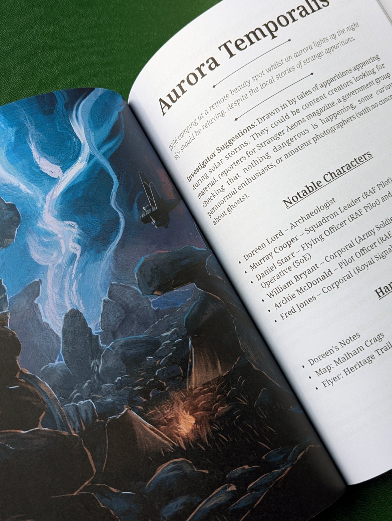 Darkened Hill & Dale is provided with a folder containing 21 pieces of handout ephemera (3 items per scenario) for players including maps, news articles, folklore book extracts, flyers, and more.